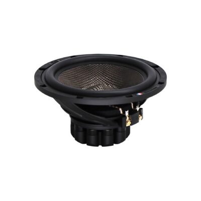 Saladier en aluminium moulé d’origine signature – nouveau moteur néodime – Membrane en fibre de carbone ultra rigide – Double spider avec tresses intégrées – Bobine sur support en fibre de verre – Cache noyau – Bornier plaqué or